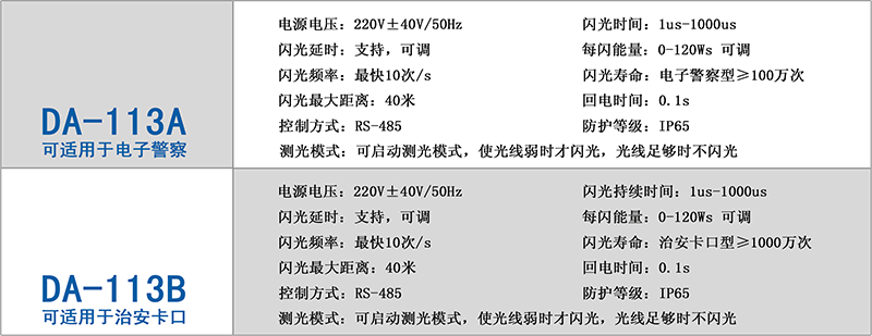 鼎光 DA-113系列數(shù)字閃光燈通過RS-485接口實現(xiàn)閃光燈的數(shù)字化控制,設(shè)定實際所需要的閃光參數(shù):閃光時 間1us-1000us內(nèi)任意可調(diào);支持閃光觸發(fā)延時,延時的時間可調(diào);可啟動測光模式,在光線弱時自動啟動閃光功 能或自動調(diào)節(jié)曝光參數(shù),保證不同光照下最佳的拍照效果;支持現(xiàn)場和遠(yuǎn)程設(shè)置參數(shù),閃光燈的特點是功能齊全, 可適用于各種智能交通抓拍系統(tǒng)的需要。是目前市場上電子警察、治安卡口升級改造的首選閃光燈。鼎光 DA-113 系列數(shù)字閃光燈分為兩個版本,具體參數(shù)如下: